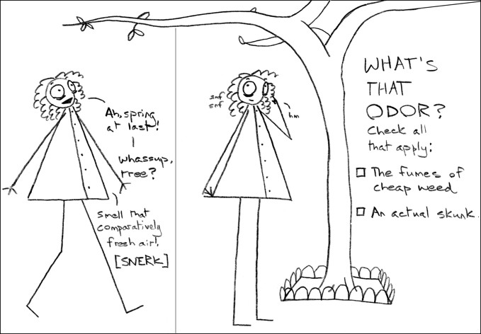 Contrary to popular misconception, Manhattan keeps going for several miles after Harlem. We have lots of wildlife up here: raccoons, hideously grinning opossums, skunks, bats, pissed-off-looking groundhogs. The skunks in particular don’t give a fuck and will stroll right down the middle of the sidewalk, fully aware that no one will give them any trouble. This being the case, I don’t know whom they’re spraying, but they do it a lot starting as soon as the weather gets warm — which is about when the stoners start opening up their windows, it seems.
